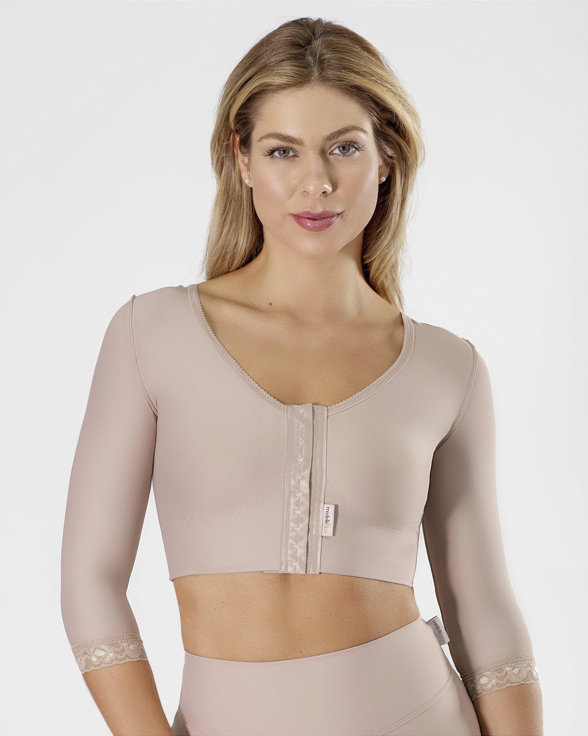 O Bolero com Mangas 3/4 da ModelleSkin proporciona suporte e compressão essenciais para o pós-cirúrgico, auxiliando na recuperação de procedimentos nos braços e tórax. Confeccionado com tecido biofuncional Infravermelho, melhora a microcirculação, reduz inchaços e acelera a cicatrização.